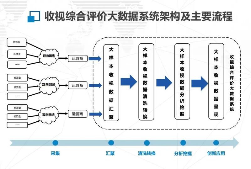 系统的运作流程为——用户收视数据由运营商(如歌华有线等)从机顶盒直接采集,通过安全通道传送至收视综合评价大数据系统。系统在对海量数据进行采集汇聚、清洗转换之后,开展建模、统计、分析等工作,输出大数据收视调查指标。