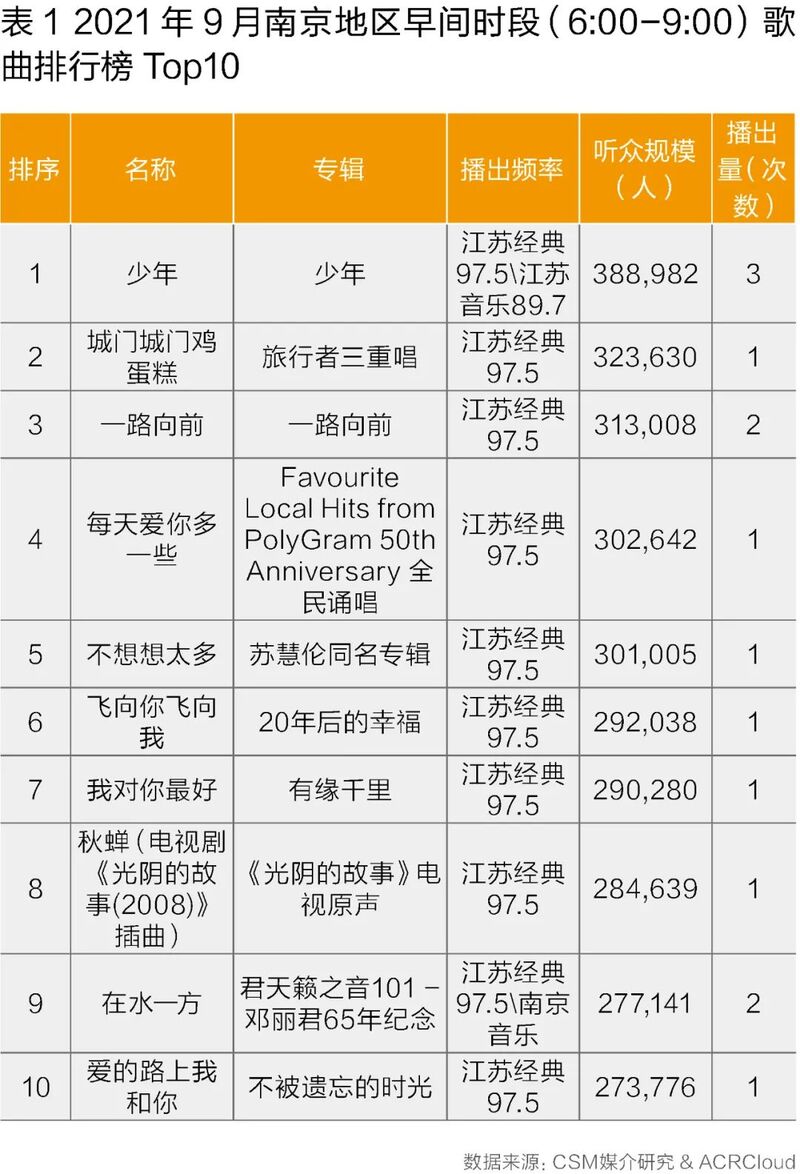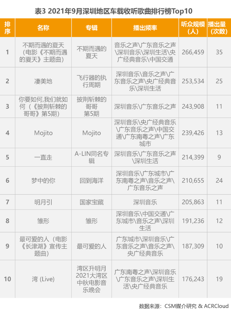 广播历来是歌曲传播的重要阵地,来自对听众的调查数据更能反馈歌曲的流行度和流传度。CSM媒介研究自2019年3月推出8大测量仪城市广播歌曲收听榜,旨在为业界提供精准、丰富而翔实的评估参考维度。2021年4月,广播歌曲收听排行榜全新升级改版,新增苏州作为第九大城市,榜单基于CSM收听率数据和ACRCloud音乐识别数据共同制作。