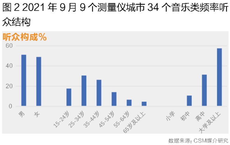 在9大城市、34个音乐类频率的听众中,男性听众比例超过女性听众;在年龄构成上,25-34岁听众比例超过其他年龄段听众,35-44岁听众收听比例也排在前列,听众占比均超过20%;从听众学历划分来看,大学及以上学历听众占绝对主体地位,占比接近60%,远超其他学历听众。歌单的听众结构呈现高学历、年轻化的趋势,这些人群是社会的中坚力量,是城市消费的主力军,同时也是对新鲜事物接受力较强的人群(图2)。