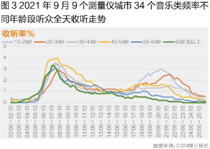 观察9个城市不同年龄段听众全天收听走势可以发现,45-54岁听众在上午6:00-12:30时段收听率最高,15-24岁听众在晚间17:30-21:30时段收听贡献最大,25-34岁听众则在21:30之后收听表现最好(图3)。