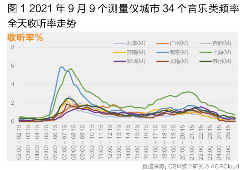 从9个城市34个音乐类频率全天收听率走势可以看出,在不同的城市存在较大差异。其中,南京地区早间整体收听率水平在9个地区中最高,早间5:30-7:30时段收听表现明显优于其他地区,早间收听率峰值达到5.9%;上海地区早间到上午收听效果均较好,傍晚自16:00-21:15时段收听率也呈逐步增长的态势;广州地区全天的收听率高峰出现在上午8:00-12:00时段;深圳地区在21:00-23:00睡前时段拉起全天的收听高峰;合肥地区全天收听高峰集中在早间7:00-8:00时段;其他几个地区全天收听率走势较为平稳,未见明显的波峰波谷(图1)。