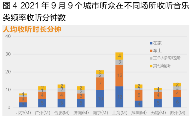 在家和车上依旧是两个最主要的广播收听场所,具体到各个城市又存在一定差异。在多数地区,家中收听量均与车载收听量相持平、甚至略高于车载收听;但在深圳地区,听众在车上收听音乐类频率的时长反超居家收听2分钟(图4)。