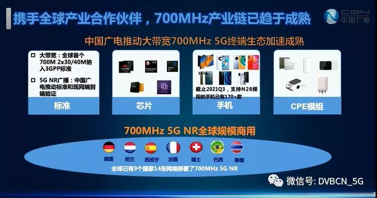 中国广电将持续推进国际标准的演进,深度参与前沿项目的研究与实践。在中国广电与全球产业合作伙伴的合作下,中国广电主导的700MHz大带宽产业链已趋于成熟;在通行的技术标准的助推下,支持700MHz的芯片、手机、CPE模组的产品形态、数量上都具备了可满足市场运营的条件。
