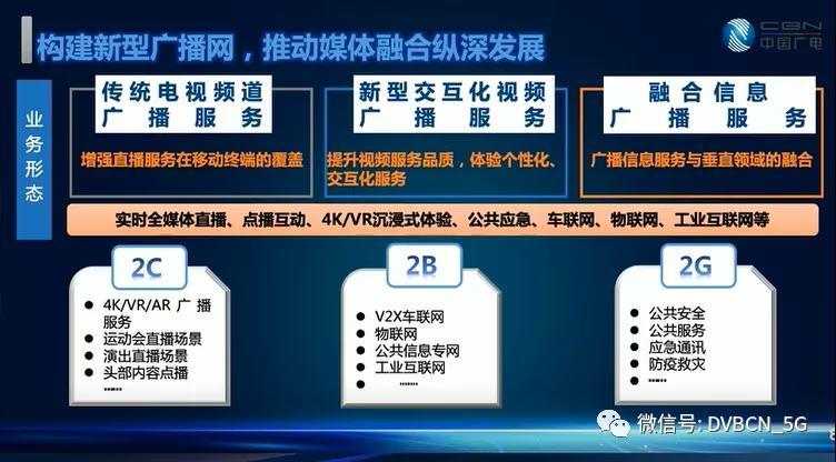 中国广电将借助5G广播网向2C、2B、2G客户精准提供传统的电视频道、新兴的交互化视频、融合信息广播服务为主的创新服务,满足全媒体的直播、车联网、工业互联网、公共服务、应急通信等场景的广播服务的需求。