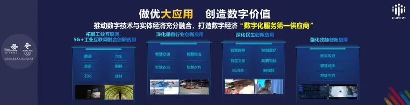 四是做优大应用,创造数字价值。中国联通作为信息通信技术与服务的集大成者,将充分发挥数字技术对经济发展的放大、叠加、倍增作用,整合内外资源,重塑能力格局,面向千行百业做优大应用,打造数字经济“数字化服务第一供应商”。着力加速行业融合,拓展工业互联网、5G+工业互联网融合创新应用,面向能源、汽车、装备、钢铁、石化、建材等行业,推广“平台化设计、智能化制造、网络化协同、个性化定制、服务化延伸、数字化管理”等新模式;着力构建为客户创造价值的数字化定制服务能力,形成“通用基座+行业应用”产品框架,培育一批规模化创新应用。通过做优大应用,以新应用、新模式、新业态助力经济社会各领域的数字化转型、智能化升级、融合化创新,加快数字中国、智慧社会建设步伐。