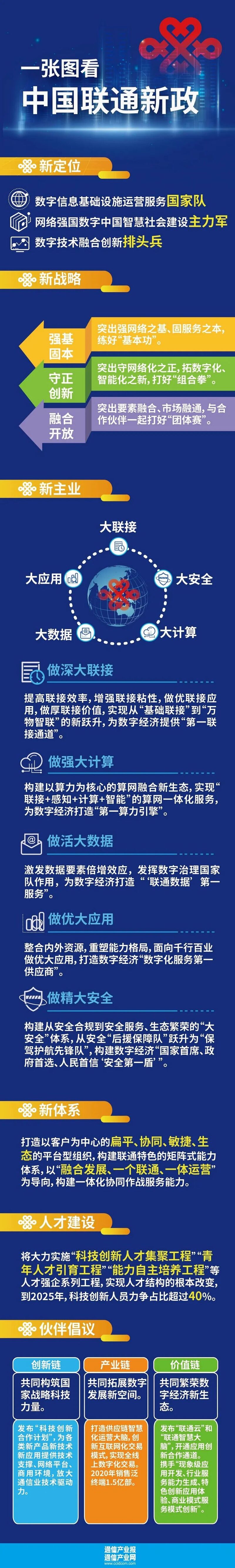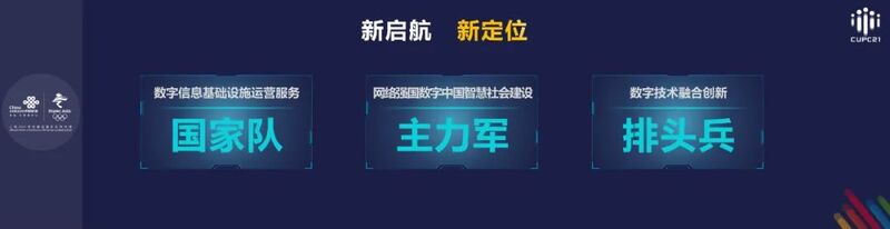 中国联通董事长刘烈宏在大会上宣布,“立足新征程,我们将公司定位为‘数字信息基础设施运营服务国家队、网络强国数字中国智慧社会建设主力军、数字技术融合创新排头兵’。”