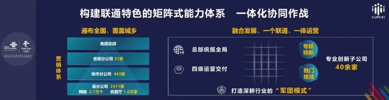 在运营体系方面,中国联通将以党建为引领,聚力打造以客户为中心的扁平、协同、敏捷、生态的平台型组织,构建联通特色的矩阵式能力体系,以“融合发展、一个联通、一体运营”为导向,构建一体化协同运营服务能力。既总部统揽全局,又四级公司运营交付;既锤炼专业公司“专精特新”的“独门绝技”,又强健省市公司定制化矩阵的服务生成。