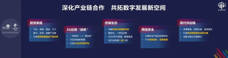二是深化产业链合作,共拓数字发展新空间。中国联通愿与各方携手打造安全、创新、畅通、高效的产业链供应链,用数字技术为客户创造价值,带动产业链融通创新、协同发展。在智慧家庭方面,加快从传统宽移融合转向以三千兆为引领、全业务为基础的智慧家庭融合产品体系。在5G应用扬帆方面,加速推动5G应用从“样板间”走向“商品房”,依托5G应用创新联盟,打造5G生态开放平台,与合作伙伴携手打好“团体赛”。在终端方面,构建有中国联通特色的泛终端新生态,扩充运营边界,丰富产品品类,实现一体化运营。在安全方面,与合作伙伴一道丰富安全产品和安全运营服务供给,促进网信安全产业优势互补、协同发展。在现代供应链方面,充分发挥供应链平台的资源集聚、供需对接和信息服务功能,打造供应链智慧化运营大脑,创新互联网化交易模式,实现全线上数字化交易。中国联通将携手产业各方共赢共享,全面开放能力,全面对接需求,在规划制定、业务匹配、采购结算、模式创新等方面透明高效合作。2022年,中国联通将与合作伙伴携手销售5G、智慧家庭及行业应用等泛终端超过1.5亿部。