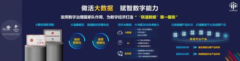 三是做活大数据,赋智数字能力。中国联通将进一步充分发挥通信大数据优势,推动多层级、跨业务的数据资源共享,打造数据治理、数据安全、数据应用等全新产品,激发数据要素倍增效应,发挥数字治理国家队作用,为数字经济打造“‘联通数据’第一服务”。着力推动数据要素化和要素数据化;着力提升大数据、AI、区块链技术融合能力;着力完善数据产品体系,打造重点行业数据平台和数据应用产品。通过做活大数据,激活数据要素价值,加快业务数据化、数据业务化,深化大数据融合应用创新,提升产业供给能力和行业赋能效应,助力经济社会发展质量变革、效率变革、动力变革。
