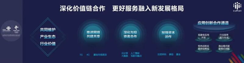 三是深化价值链合作,更好服务融入新发展格局。中国联通愿与行业合作伙伴、投资者等进一步深化合作,增强要素配置和保障能力,推动价值链提升。全方位推进网络共建共享,持续推进5G、4G、基础网络资源的共建共享,拓展网络的广度、深度和厚度。同时我们将加强生态协同,共同维护良性产业生态和行业价值。继续深化与投资者合作,充分发挥各自优势,在云计算、大数据、人工智能、互联网触点等领域深化能力提升和产品推广,扩大战略协同效应,释放更多红利。进一步加强资本运作,围绕五大主责主业,综合运用投资并购、参股、基金等多元化方式,推动重点业务领域快速突破,放大国有资本功能。中国联通稍后将发布“联通云”和“联通智慧大脑”,开通应用创新合作通道,与各类合作伙伴合作,在“现象级应用开发、行业服务能力生成、特色创新应用体验孵化、商业模式服务模式创新”等多方面,激发创新创业活力,共同繁荣数字经济新生态。