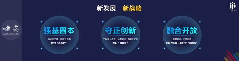 基于新定位,中国联通战略升级为“强基固本、守正创新、融合开放”12个字,更加突出强网络之基、固服务之本,练好“基本功”;更加突出守网络化之正,拓数字化、智能化之新,打好“组合拳”;更加突出要素融合、市场融通,与合作伙伴一起打好“团体赛”!
