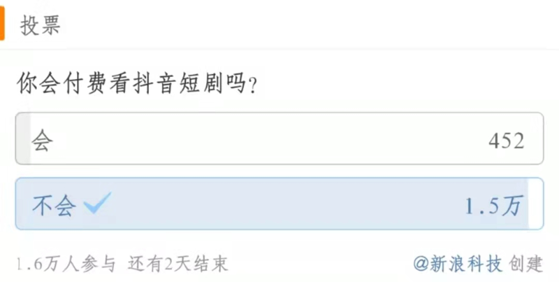新浪科技发起了【你会付费看抖音短剧吗】投票,结果呈现一边倒的趋势。