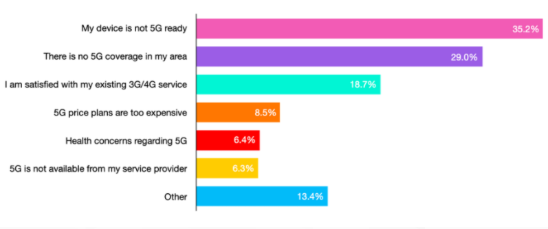 其次,还有29%的用户不使用5G是因为他们所在的地区还没有覆盖5G信号。虽然一些大型移动运营商声称5G信号已经覆盖全国90%的地区。但实际情况是还有近三成的用户无法接入5G网络。