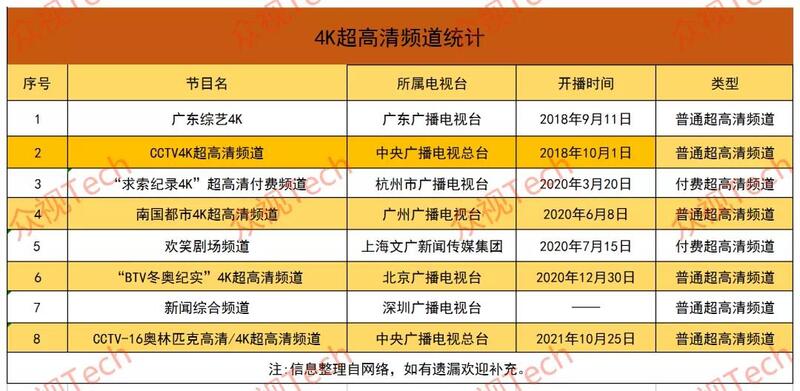 4K超高清频道统计