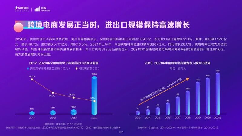 【流媒体网】摘要:2020年,我国跨境电子商务蓬勃发展,海关总署数据显示,全国跨境电商进出口总额达1.69万亿,按可比口径计算增长31.1%。其中,出口额1.12万亿元,增长40.1%;进口额0.57万亿元,增长16.5%。2021年上半年,中国跨境电商进出口额为8867亿元,同比增长28.6%,跨境电商已成为外贸发展新动能、转型升级新渠道和高质量发展新抓手。第三方机构Statista数据显示,2021年中国通过跨境电商购买海外商品的消费者预计将达到1.6亿,海外消费者增长势头迅猛。(文末附有报告全文链接,欢迎今日流媒体VIP会员下载阅读!)