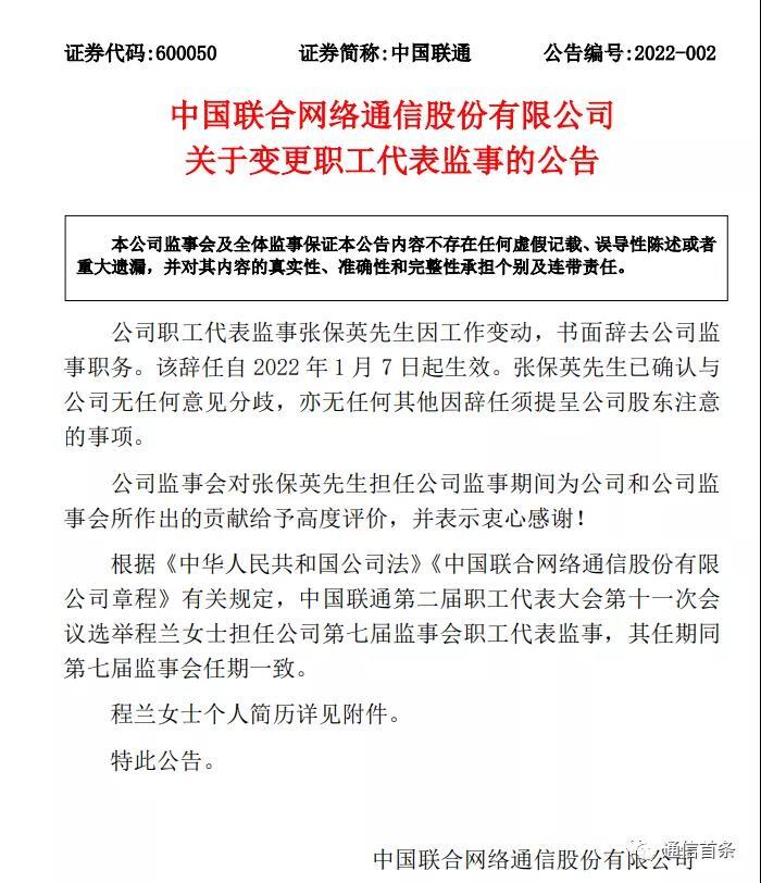 程兰任中国联通监事 张保英辞任
