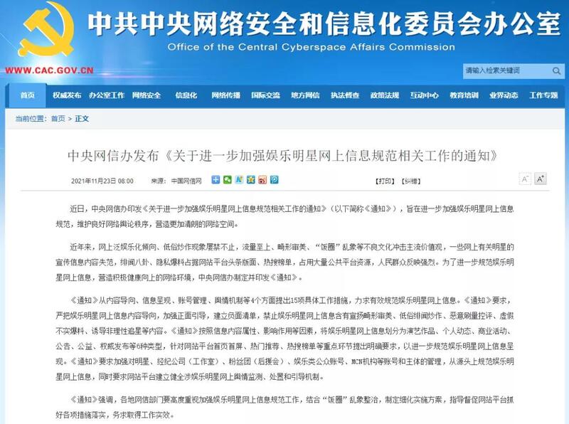中央网信办印发的《关于进一步加强娱乐明星网上信息规范相关工作的通知》也指出,加强对明星、经纪公司(工作室)、粉丝团(后援会)、娱乐类公众账号、MCN机构等账号和主体的管理,从源头上规范娱乐明星网上信息,同时要求网站平台建立健全涉娱乐明星网上舆情监测、处置和引导机制。