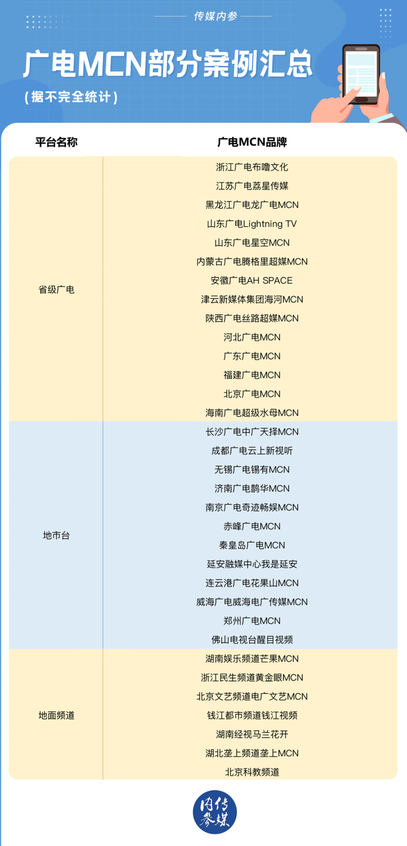 从2021年来看,省级广电MCN化改革明显提速。除了此前的浙江广电、江苏广电、黑龙江广电、山东广电、内蒙古广电外,2021年以来诸如北京广电、河南广电、福建广电、安徽广电、陕西广电、天津广电等省级广电在MCN领域的进程和动作都明显加快。