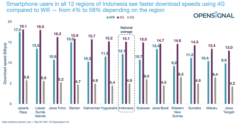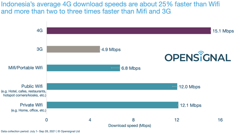 4G 为印度尼西亚的移动用户提供了比 Wifi 更好的下载速度。在全国范围内,智能手机用户的4G下载速度平均为 15.1 Mbps,比大多数 Wifi(私人和公共热点)快约 25%,是使用 Mifi 设备的两倍多。公共 Wifi 和私人 Wifi 上都看到了类似的体验,速度统计上相同,略高于12 Mbps。另一方面,用户在 Mifi 设备和 3G 上的平均体验分别为 6.8 Mbps 和 4.9 Mbps。