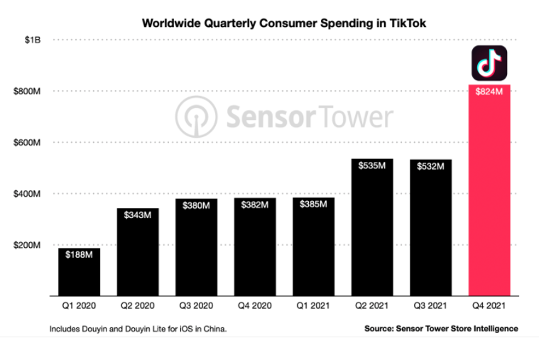 Sensor Tower 最新数据显示,2021 年用户在这款移动应用上花费了大约 23 亿美元(包括 iOS 版本的抖音),与 2020 年的 13 亿美元相比,这一数字同比增长了大约 77%。