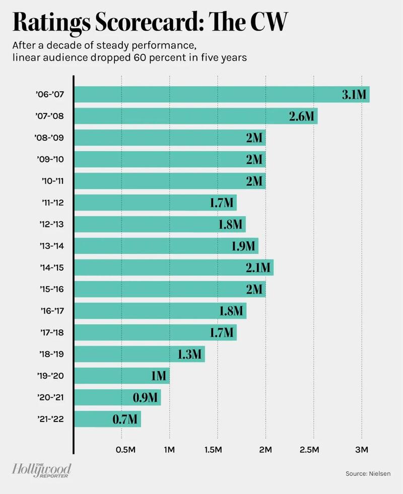 过去五年间,CW收视率锐减60%。图片来源:THR/Nielsen