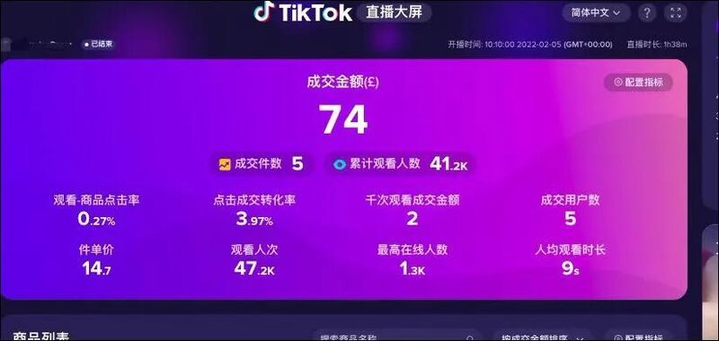 “我们公司做TikTok算是头部了,现在最头疼的是市场不成熟,短视频爆百万流量对直播间的GMV提升都不会超过10%。现在单场平均500-1000英镑,前天有一个拉通10小时的做了12000英镑,应该是跨境直播的记录了。”