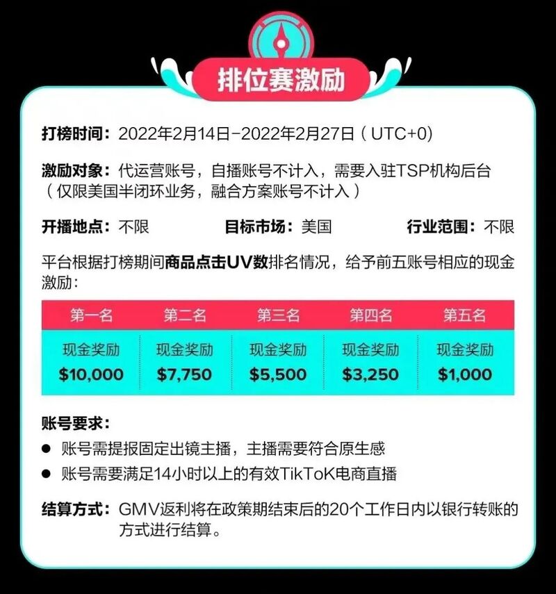 根据计划内容,在2022年2月14日-2022年2月27日(UTC+0)期间,入驻TSP后台的代运营账号参与打榜,平台会根据打榜期间商品点击UV数排名情况,给予前五账号最高10000美元、最低1000美元的现金奖励。
