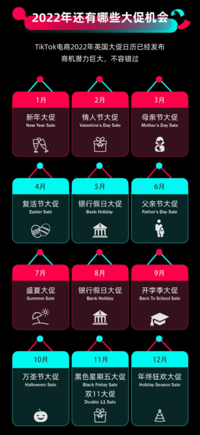 就在前不久,TikTok Shop官方还发布了TikTok电商2022英国大促日历,公布了2022年12个月的营销大促活动。这背后有着TikTok后续一系列流量的投入和扶持外,同时也表明TikTok团队已经初具成熟、稳定的运营能力。