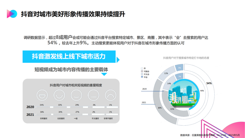 【流媒体网】摘要:关于抖音你了解多少?除了直播带货,现在抖音对城市美好形象传播的效果也在持续提升,根据调研数据显示,超过8成用户会或可能会通过抖音平台搜索特定城市、景区、商圈,其中表示“会”去搜索的用户达 54%,较去年上升9%。主动搜索更能体现用户对于抖音在城市形象传播方面的认可。(文末附有报告全文链接,欢迎今日流媒体VIP会员下载阅读!)