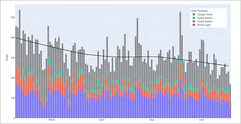 在家庭中实施的所有智能设备中,接受度最高和使用最多的设备是 Google Home 助手。数据收集显示,所有家庭的老年人每天都在使用该产品。