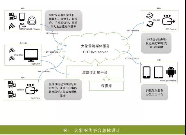 大象图传平台的软件系统以河南广播电视台自主研发的大象流媒体服务平台为核心,通过封装UDP传输包,在确保通信安全、传输稳定、信号低延迟的前提下,增加了权限管理及内容生产相关的服务及功能。平台服务包括多协议信号接入功能、编码解码功能、云导播功能、视频内容筛查审核功能、用户权限功能、流信号在线剪辑功能、视频文件在线编辑功能、云收录功能、发布管控功能、传播数据收集功能等项目。