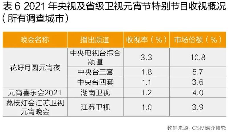 2021年元宵节,中央广播电视总台的《花好月圆元宵夜》在中央台综合频道、中央台三套和中央台四套播出的总收视率达到6.2%,同时段市场份额20.1%。省级上星频道中,湖南卫视、江苏卫视也都举办了元宵晚会,其中湖南卫视的《元宵喜乐会2021》的平均收视率为1.2%,同时段份额4.0%;江苏卫视《荔枝灯会江苏卫视元宵晚会》的平均收视率为1.0%,同时段份额3.9%(表6)。