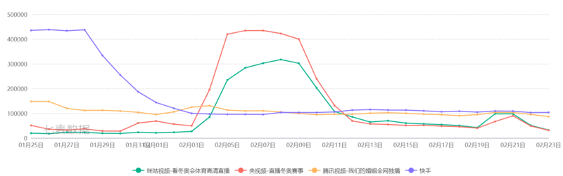 此次冬奥版权,咪咕和央视频都拥有赛事直播权益,而腾讯视频和快手只有点播回看权益。从上图下载量对比不难发现体育赛事直播权益的重要性,腾讯视频和快手在冬奥会期间并未经历这样的大起大落,冬奥没有为它们带来显著的流量增长,但持续的优质内容供给,让它们的下载量平稳地维持在10万左右。