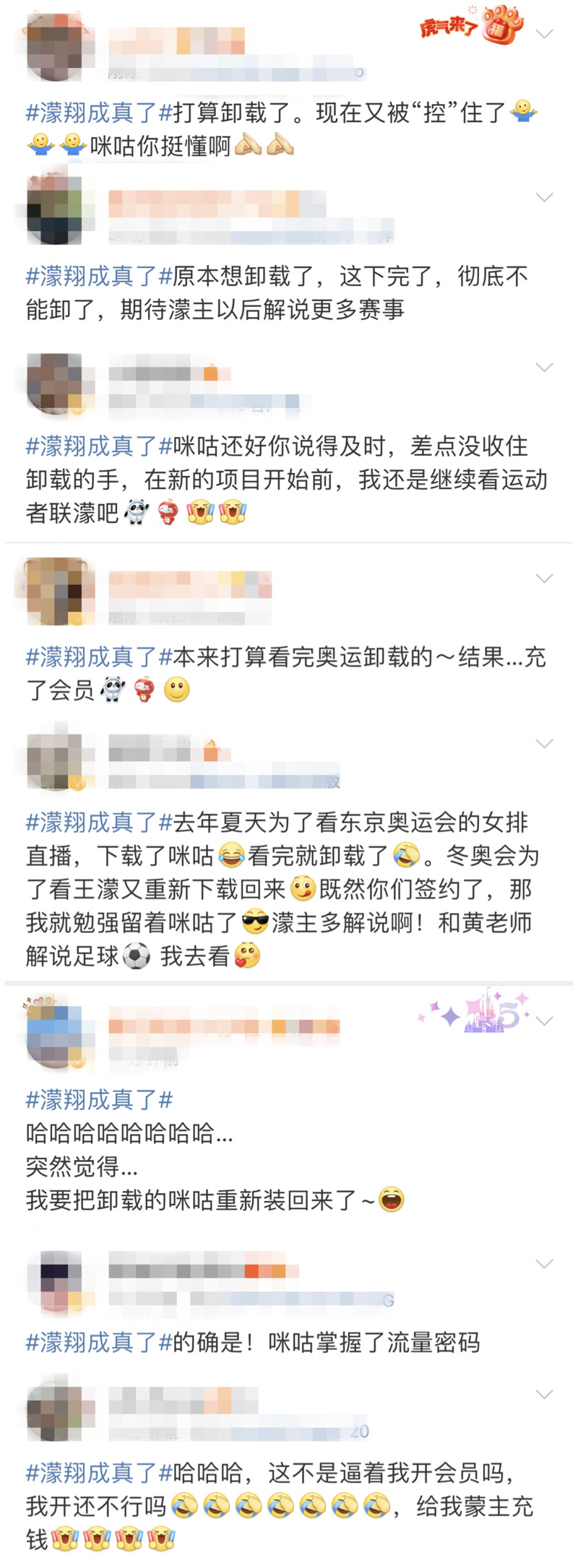 咪咕视频也在做各种尝试,譬如围绕王濛做了很多文章。冬奥期间,黄健翔与王濛的“拍案组合”圈粉无数,咪咕视频迅速上线了“太好笑了·王濛单口相声解说”合集,制作了冬奥衍生综艺《运动者联濛》,推出了王濛的签名款手办,并宣布把王濛“焊死”在咪咕解说席上,将在后续开启全新周期的深度合作,包括赛事解说、自制综艺、视频彩铃、健身课程等,还将携手王濛的体育MCN机构,以体娱跨界的形式展开合作。从用户的反馈来看,确实有一定的成效。