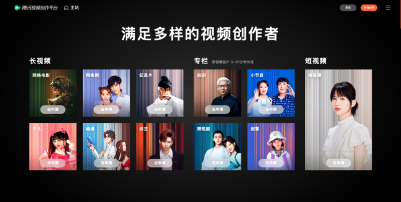 机构型作者在PC端访问腾讯视频创作平台(地址:mp.v.qq.com),点击首页“登录”后,选择专栏-小节目,进入项目申请合作页面,提交资质及实名认证后,待审核通过,即可获得会员分账合作权限。