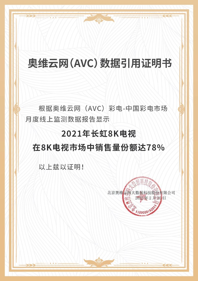 日前,由长虹8K电视带动的整个彩电市场迎来开门“虹”。2月25日,奥维云网发布的中国彩电市场月度监测报告显示,2021年,长虹8K电视在8K电视市场中销量份额达78%。另外,从京东品类销量排行榜上,8K电视销量前三则由长虹55英寸、65英寸、和75英寸的D8K霸榜。
