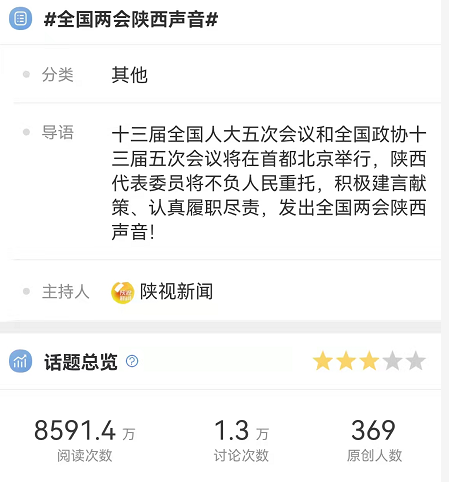 截至3月11日,集团以自主可控客户端“起点新闻”为内容源发核心、以“陕视新闻”品牌组成的商业互联网平台矩阵进行渠道扩发覆盖,总传播量超过2亿次,“陕视新闻”主持话题#全国两会陕西声音#阅读量超过8500万。