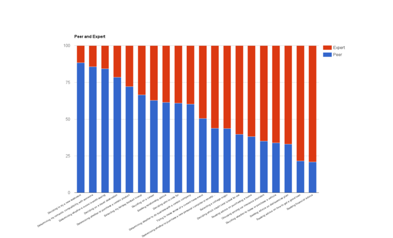 图注:20个假设场景中,人们在选择新餐厅、制造浪漫、选择影片等方面主要听取亲友的建议 来源:The Bottom Line