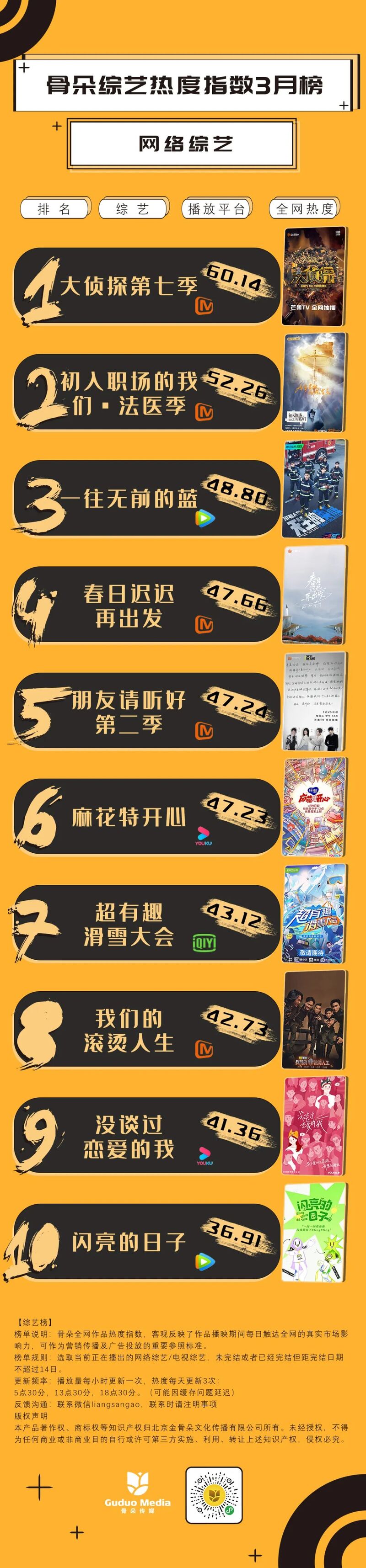 相较上月,《一往无前的蓝》《朋友请听好第二季》热度上升,来到榜单第3和第5;恋综《春日迟迟再出发》位置不变。《麻花特开心》《超有趣滑雪大会》《我们的滚烫人生》三部播出时间较久,长尾效应未能延续,热度有所下滑。