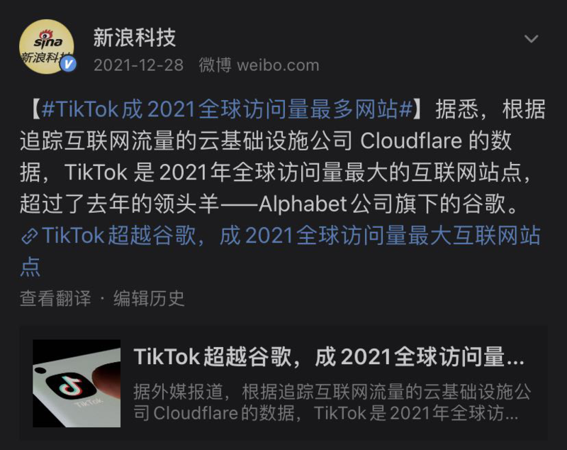 不仅如此,根据网络安全公司Cloudfare的2021年全球流量报告显示,TikTok在2021年取代谷歌,成为去年全球访问量最高的网络平台。要知道这个位置,在TikTok之前,谷歌已经稳稳地坐了十五年。