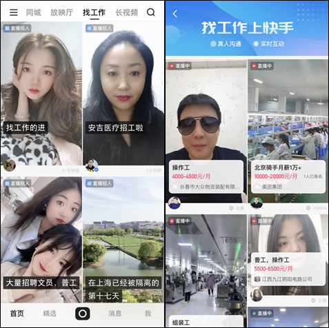 同时,快手新版本的功能在强调用户社交,最突出的就是在同城中植入附近的人,将基于地理位置的同城逻辑植入找工作版块,也是平台开始在回归老铁经济的体现。