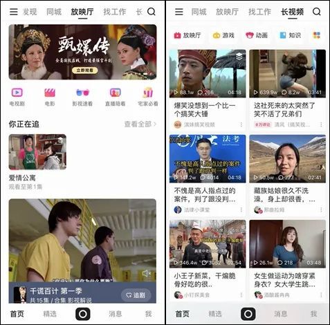除了底部有较大变化外,「首页」变化也比较大,它的Tab页面变得更加丰富,除了有「关注」、「发现」、「同城」外,还新增了「放映厅」、「找工作」、「长视频」,这些页面都是采用双列Feed流的排布方式,把内容选择权再度交还给用户手中。