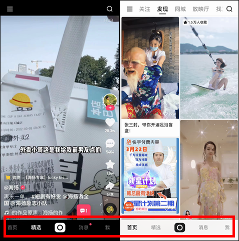 一位长期关注快手的行业资深人士表示,在APP内,底部入口比顶部入口流量要大,这次更新中「精选」页面重回底部,可以看出其权重被增加。