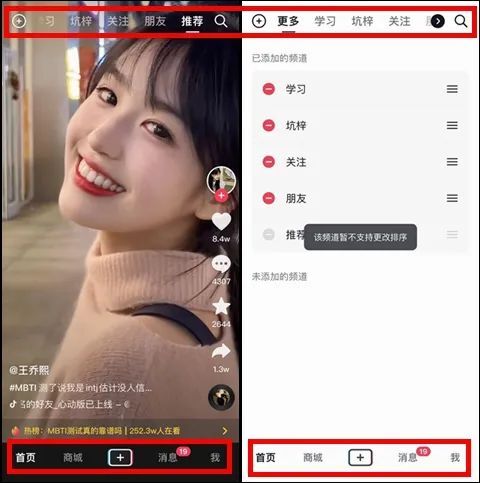 体验到内测新版本的抖音资深用户大可表示,在「更多」页面调整首页Tab排序的时候,「推荐」页排在最后还不能调整,而自己打开抖音时「首页」并不一直都是「推荐」页,有时候会是「朋友」页面。