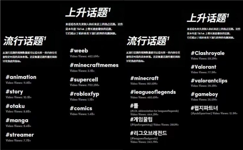 北美地区游戏行业与多不同行业产生交叠,系列游戏NBA 2K通过征集 NBA 巨星 Zion Williamson 的作品发起挑战,并将获胜者的游戏玩法添加进下一代游戏并发行,增强TikTok上用户参与感;在韩国,有超过50%的韩国人选择在智能手机上玩游戏,并且海外游戏在韩国用户心中的地位逐渐显现。随着全球电子竞技比赛的成功,海外游戏在韩国的关注度和人气增势明显。就上图标签中#Clashroyale(芬兰游戏公司supercell推出的一款即时战略类手机卡牌游戏)和#Valorant(美国游戏开发商Riot Games开发以及出版的免费多人第一人称射击游戏)而言,其视频浏览量分别增加827%和780%。