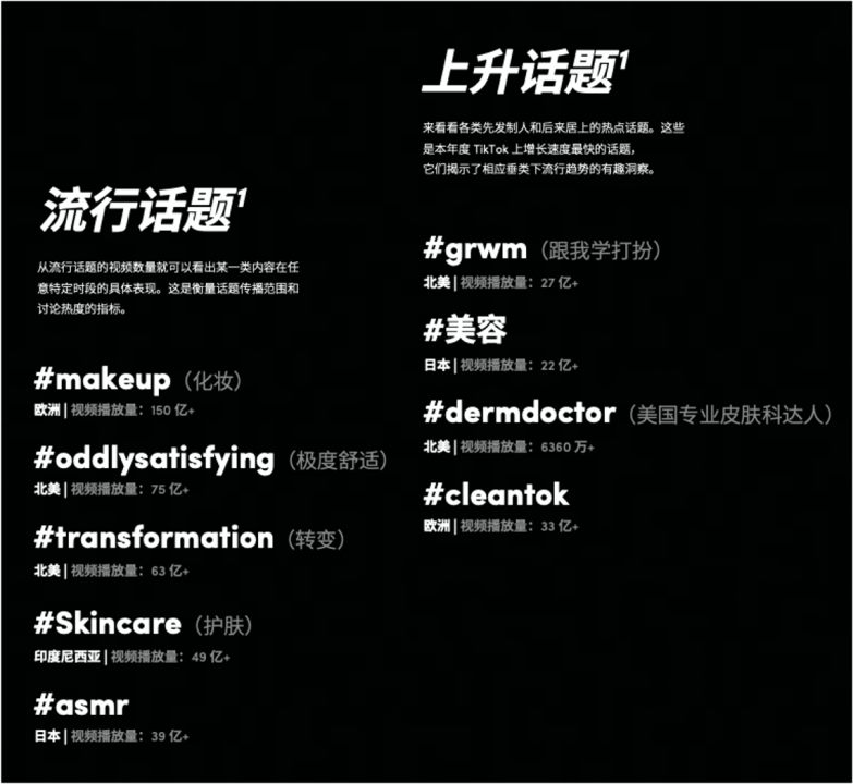 2021年,美妆与个护涌向TikTok,这些爱好者们不只关乎提升外在形象,更加关注内在美和自我呵护,#makeup(化妆)在欧洲的视频播放量超过150亿次;#oddlysatisfying(奇奇怪怪的治愈感)在北美地区视频播放量超过75亿次。