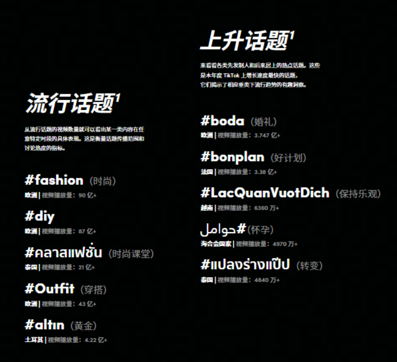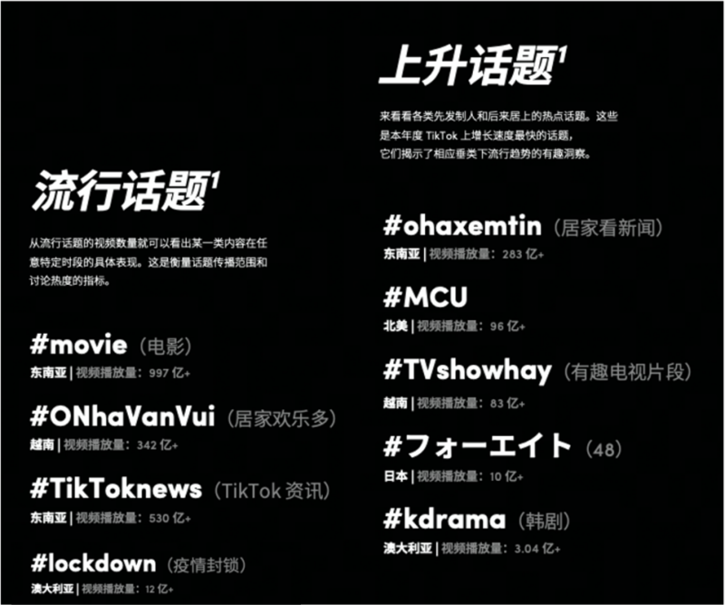 近日,TikTok for Business发布了《What's Next》报告,旨在洞察TikTok上的全球流行文化趋势。通过该报告,TikTok在全球多个市场分别呈现了各自当下的内容流行文化趋势,TikTok for Business《What's Next》报告展示分析了不同区域上的TikTok热门话题,帮助广告主全面了解市场最新的内容动向。这也是出海营销亦不可错过的宝贵资源。