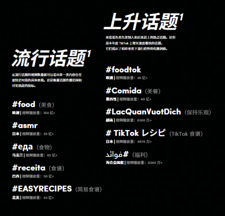 TikTok上美食爱好者们通过热情分享呈现活色生香的家庭菜谱和饮食体验,这份热爱空前高涨,#food(食物)在欧洲地区播放量超过184亿次,而在日本、海合会地区,ASMR(观看刺激视频时,获得的“刺痛感”)、 地区美食吃播,甚至是厨房收纳等主题展示了餐饮分类中娱乐元素的演变。