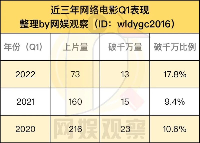 上片少还体现在2022年第一季度网络电影的市场表现。