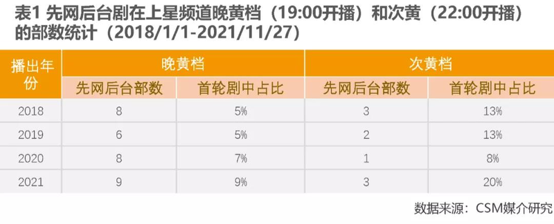根据CSM上星频道节目监播数据显示,先网后台剧播出量从2018年至2021年总播出约40部。其中,晚黄档共31部,2018-2020年年播出量控制在6-8部,在首轮剧中年占比约5-7%,2021年提升到9部、占比9%。